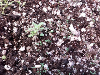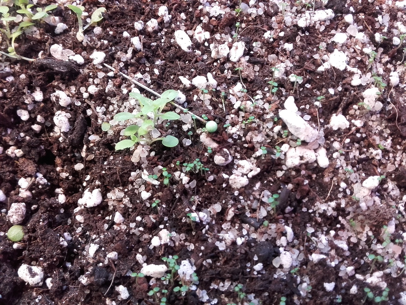 A jeden výsevní rébus na závěr aneb o netrpělivosti bylin a rozvážnosti stromů: uprostřed tohoto obrázku se pro pochopení správných měřítek nachází špendlík. Vlevo od něj jsou dobře viditelné výhonky stévie (Stevia rebaudiana), to téměř neviditelné napravo jsou výhonky kajeputu (tedy tea tree, Melaleuca alternifolia).